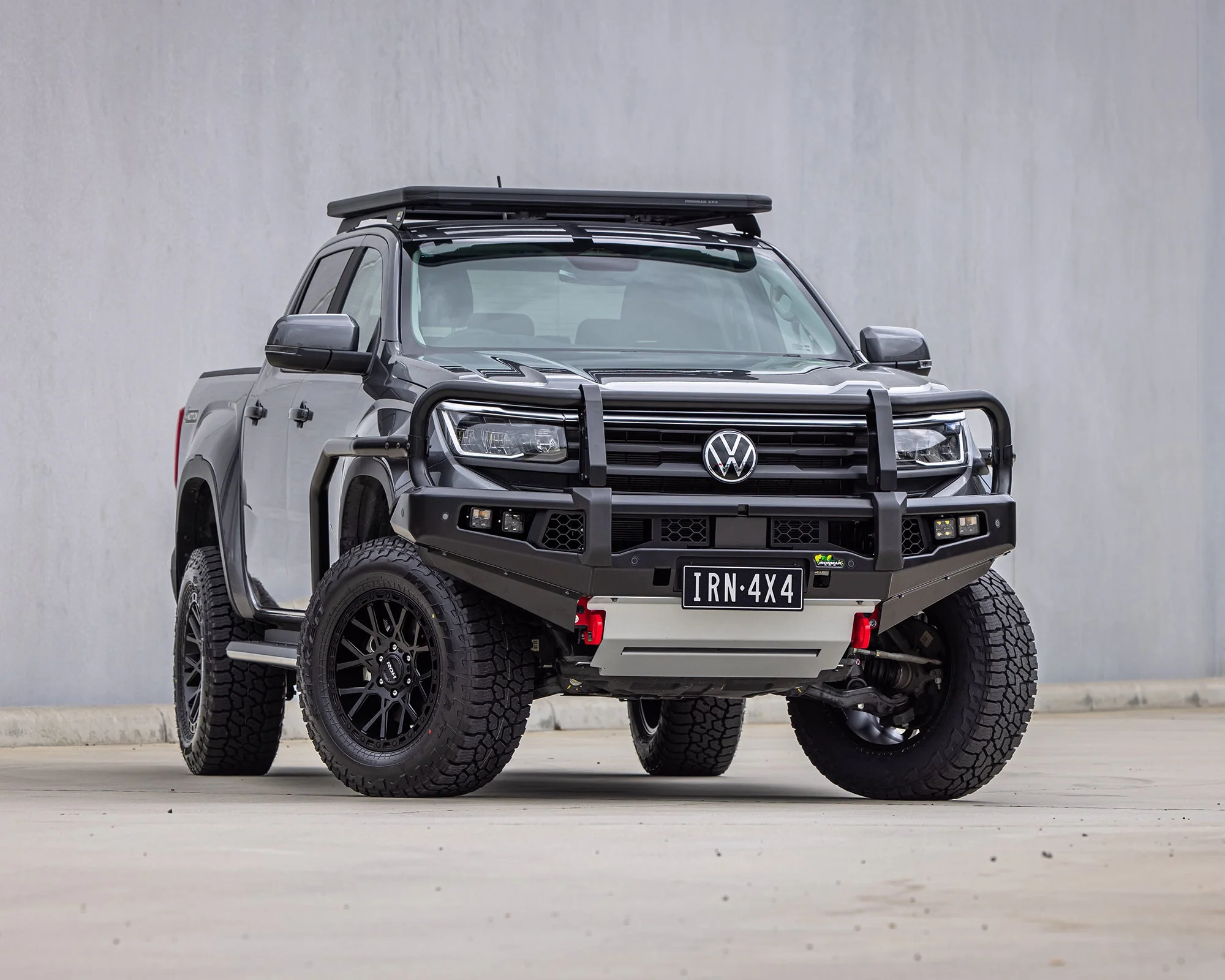 Heavy-duty powder-coated steel bull bar with integrated fog light mounts. Fits Amarok 2H 2010-2023 and NF 2023+. Airbag compatible.